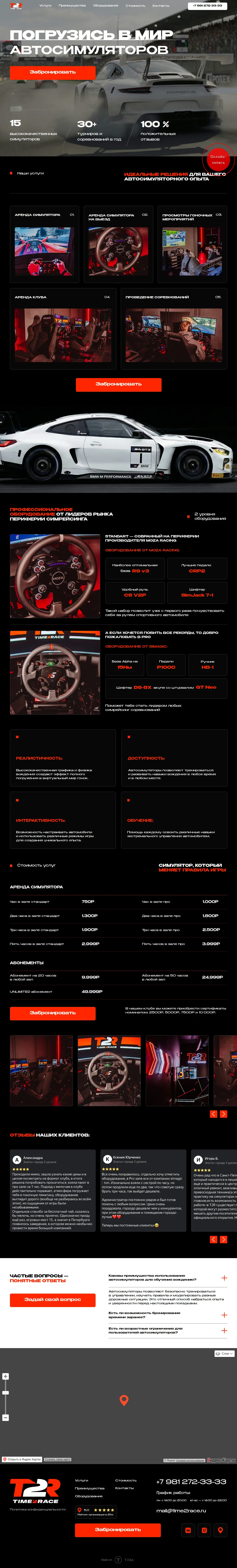 Цель проекта — разработать конверсионный сайт для клуба автосимуляторов Time2Race, который работает как посадочная под рекламный трафик: быстро доносит ценность, усиливает доверие и ведёт пользователя к онлайн-бронированию. Дополнительно важно было упаковать формат клуба так, чтобы сайт визуально и по подаче соответствовал нише автосимуляторов и “продавал” атмосферу.